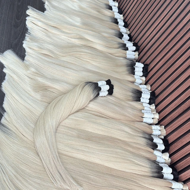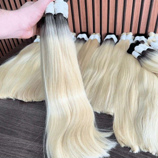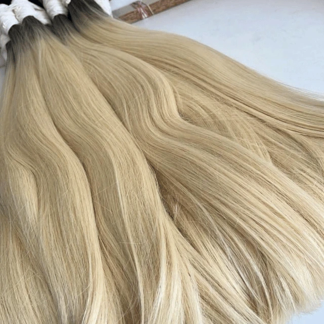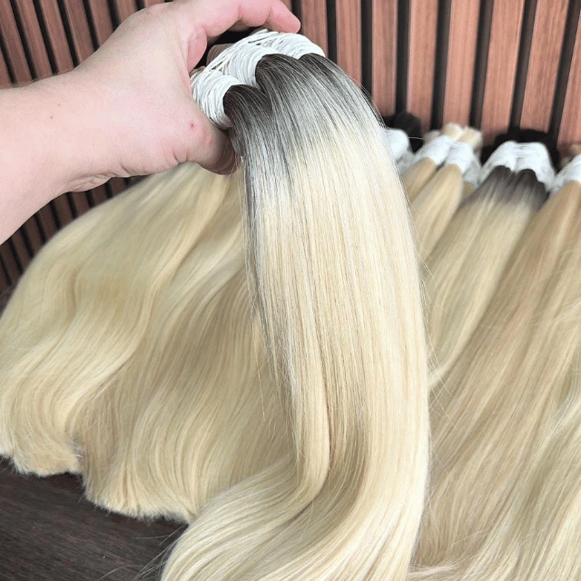 Cabelo Humano Vietnamita Loiro Raiz Esfumada: fios premium 100% naturais, com raiz esfumada, brilho intenso e pontas cheias para um visual sofisticado.